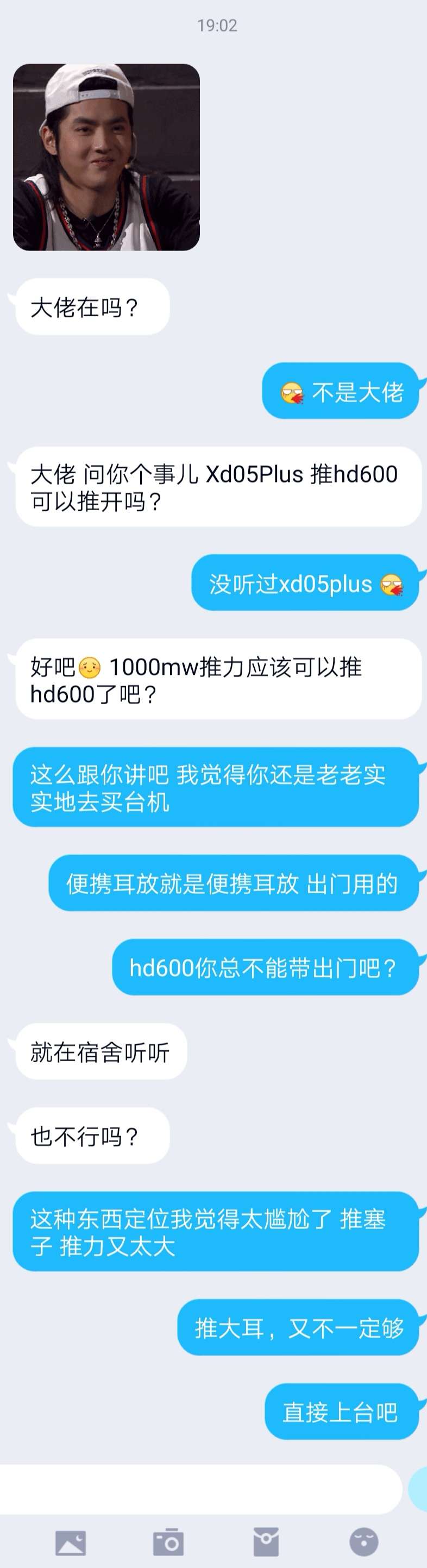 一个刚刚入烧的朋友,说想用XD05Plus推HD600,问我听过没有。我没有听过,但是我一直觉得这种东西定位太尴尬。随身做1000mw推力,推塞子显然用不着,也不方便带,不如直接上前端;推大耳又不够,而且大耳不能出门,不如直接上台。