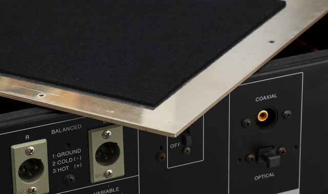 XA7ES重达15KG的重量其中一部分来自其厚重的外壳,如其顶盖、侧板均为3.2MM的铝合金板。当然其与下面Wadia 381来说还是逊色不少,毕竟25KG的重量,高达5MM的铝合金以及它坦克般魁梧的身材都在证明这是个不好惹的主。XA7ES也很注重避震设计,如顶盖下面覆盖了一层避震材料,与顶盖接触的地方也贴了一层避震阻尼物。