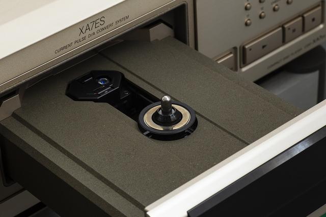 索尼XA7ES发布于1994年,(黑色版本发布于1995年)公开发售价为25万日元,加上关税约合人民币两万多元,采用了索尼引以为傲的固定光头设计(Fixed Pick Up Mechanism)。在这里简单引用一些资料:当其他公司把眼光放在唱机中摇来晃去的CD,而想尽办法要让它稳定时(最为极致的莫过于TEAC的VRDS系统了),SONY却发现移动中的镭射头由于质量太小的缘故,极容易被外力干扰而产生不必要的震动,因而影响读取讯号的正确性。因此索尼在此运用了完全不同于其他厂商的设计方式,他们选择将质量较轻,易受外力震动影响的镭射头固定,然后让较重,可以较稳定动作的CD托盘移动迎合激光头的读取动作这种使光盘在机芯上移动的检索方式,减轻了拾音器的压力,与传统的拾音移动方式相比,其进出仓的速度轻盈有度,信号的读取稳定准确,同时光盘的碟镇采用纯铜制作,由上方下压来运作,降低了光盘高速运转时的振动。