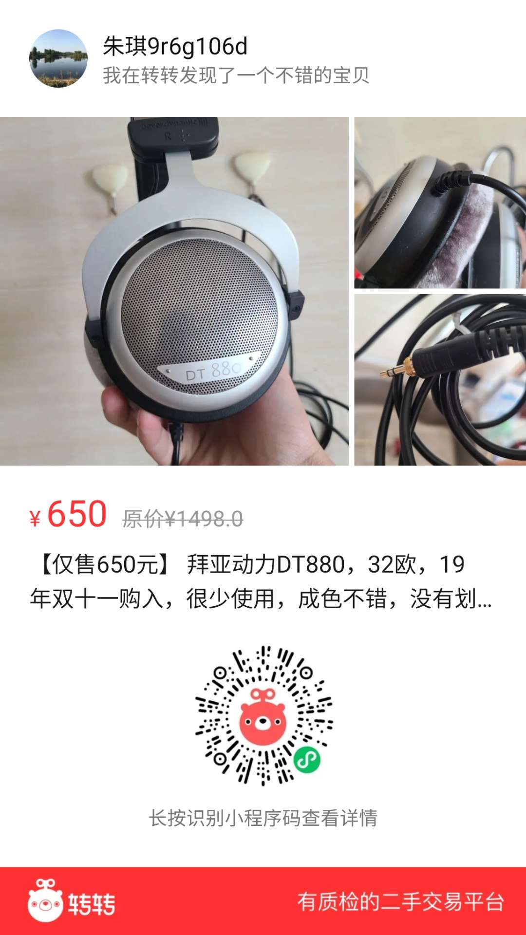 19年双十一购入,拜亚动力DT880,32欧,手机可推。包装盒扔了,皮包还在,很少使用,外观非常不错,没有任何磨损,大耳外出不方便携带,所以买来吃灰闲置。睡前偶尔听几首歌,总共也没用几十次,一口价650包邮,不刀