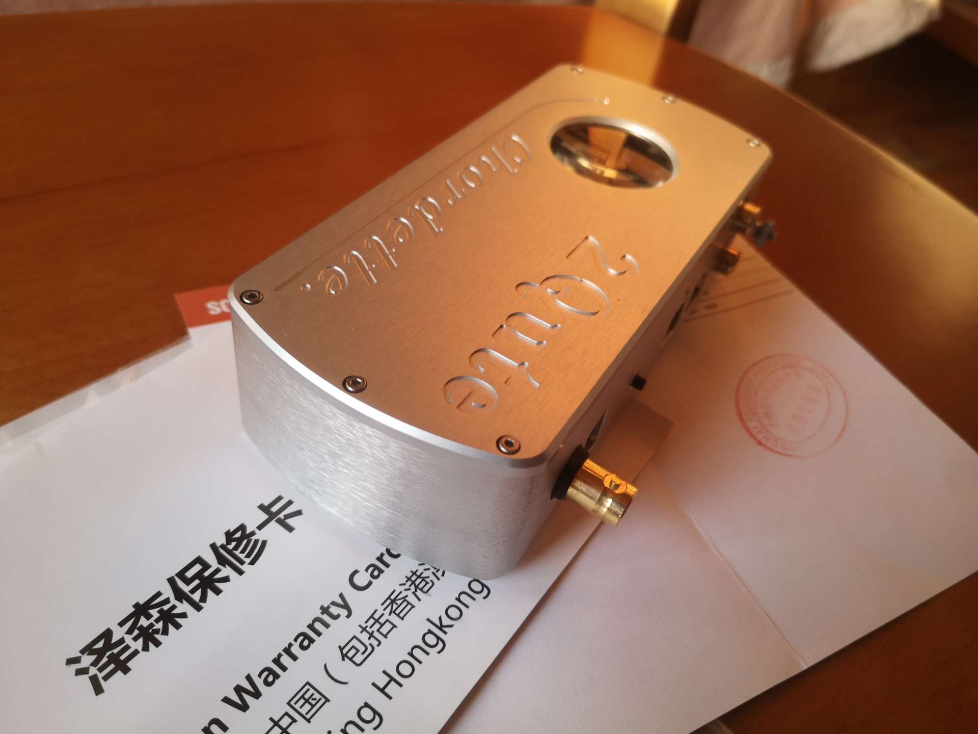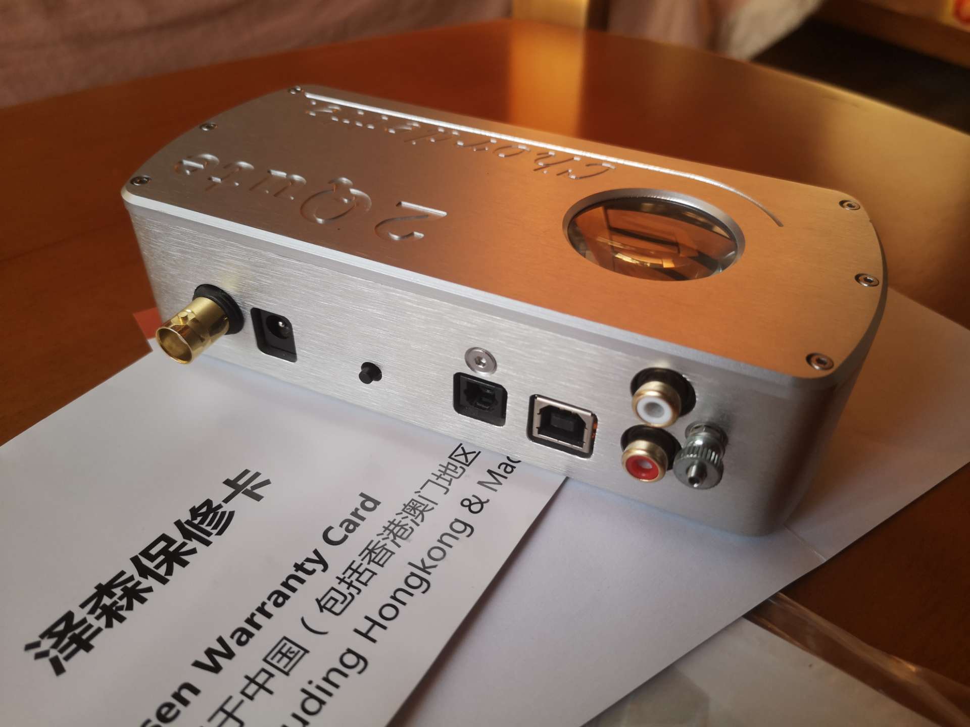 泽森行货箱说全(含圆声带出库单),机器成色很好,自定9新以上,具体看图。红圈处是设备插拔时不小心造成的磕印,光纤口的盖子找不着了。玻璃窗内有可见灰尘,这是正常现象,我在坛里发过帖子专门问过,有意可搜看。机器声音、功能没有什么问题。配件如图。
