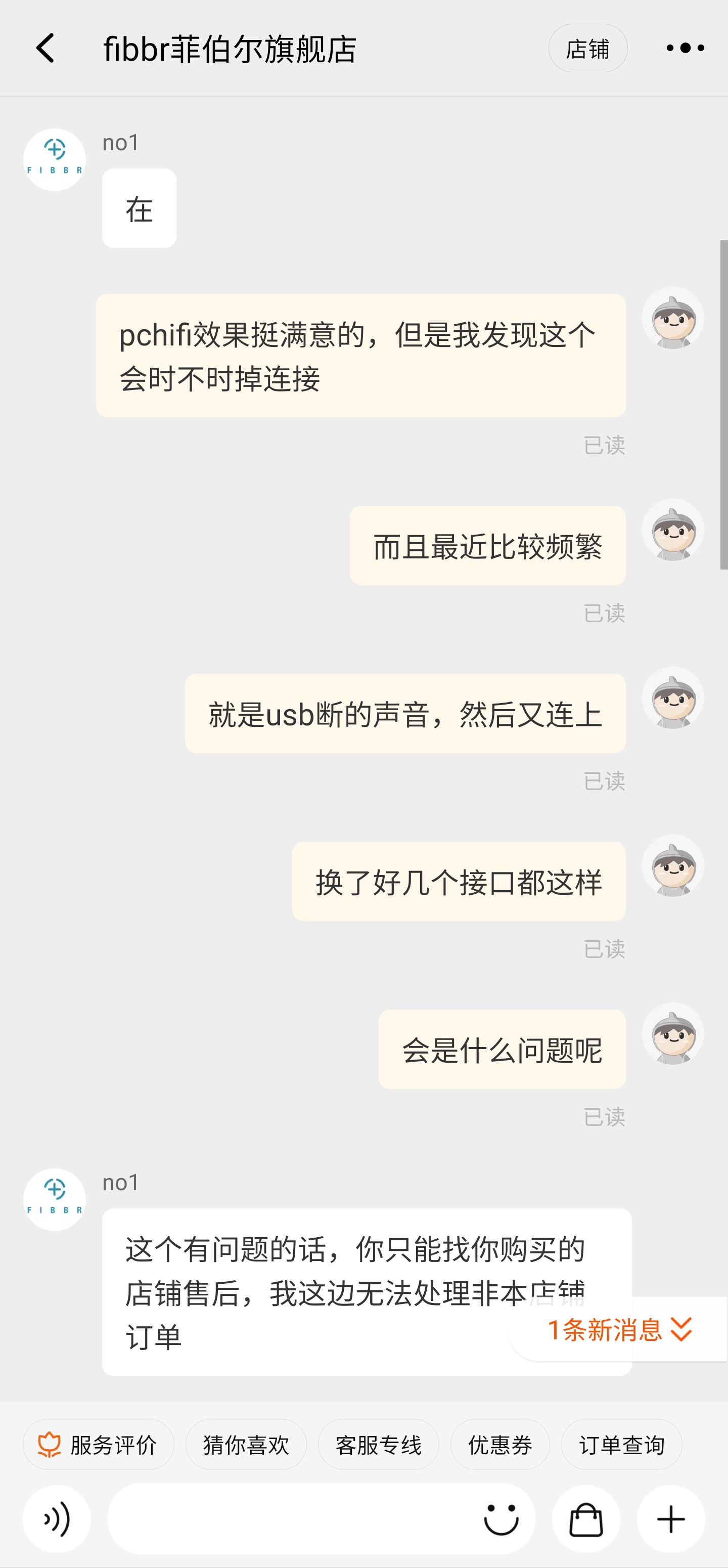 效果确实还是有,但最近发现总是听一会儿歌就断usb连接,昨晚折腾了一晚上换接口换供电,还是这样,没有办法就想去咨询一下他们家官方客服,想知道会是什么可能引起的,然后就有了这么牛逼的对话