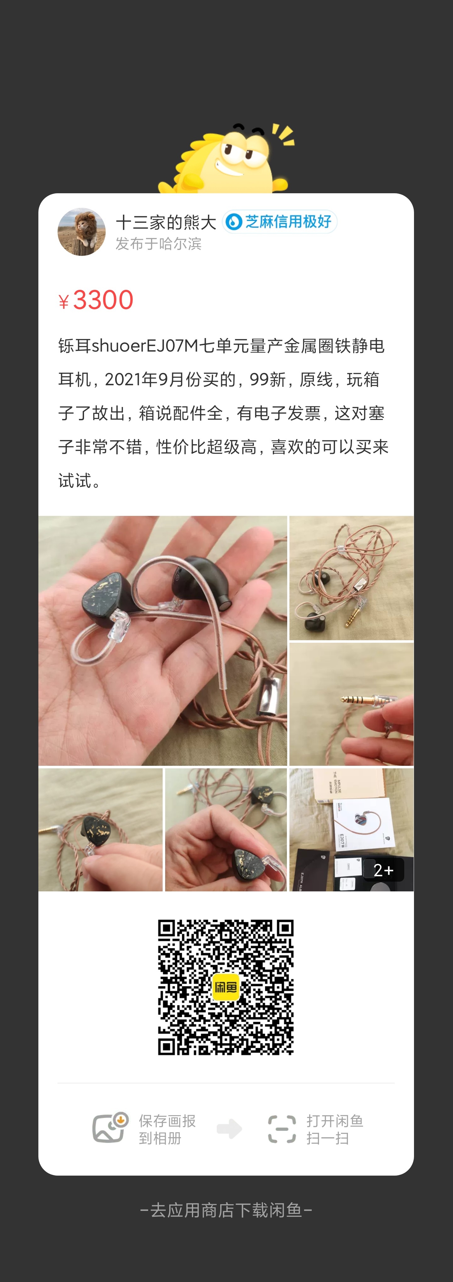 铄耳shuoerEJ07M七单元量产金属圈铁静电耳机,2021年9月份买的,99新,原线,玩箱子了故出,箱说配件全,有电子发票,这对塞子非常不错,性价比超级高,喜欢的可以买来试试。