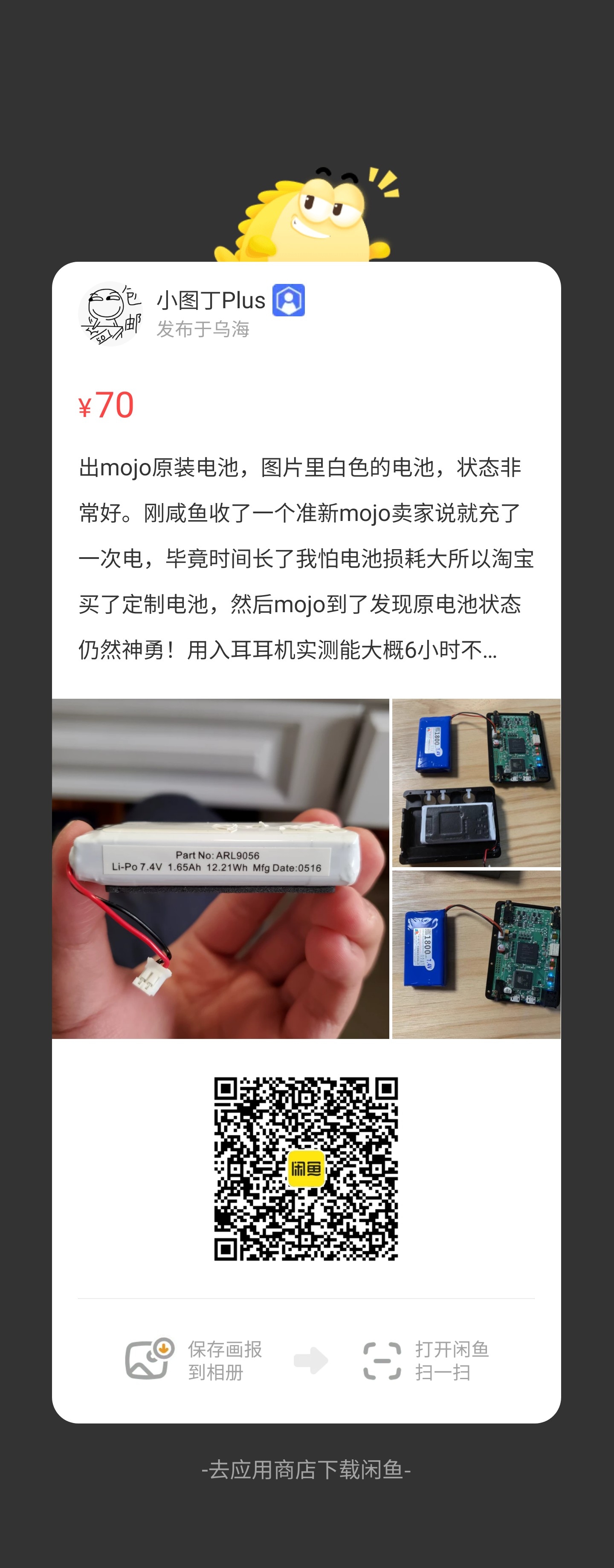 出mojo原装电池,图片里白色的电池,状态非常好。刚咸鱼收了一个准新mojo卖家说就充了一次电,毕竟时间长了我怕电池损耗大所以淘宝买了定制电池,然后mojo到了发现原电池状态仍然神勇!用入耳耳机实测能大概6小时不喘气,而后新电池到了,但是电池不能放着啊会损耗的,所以把旧的出了换新的,保护环境人人有责!