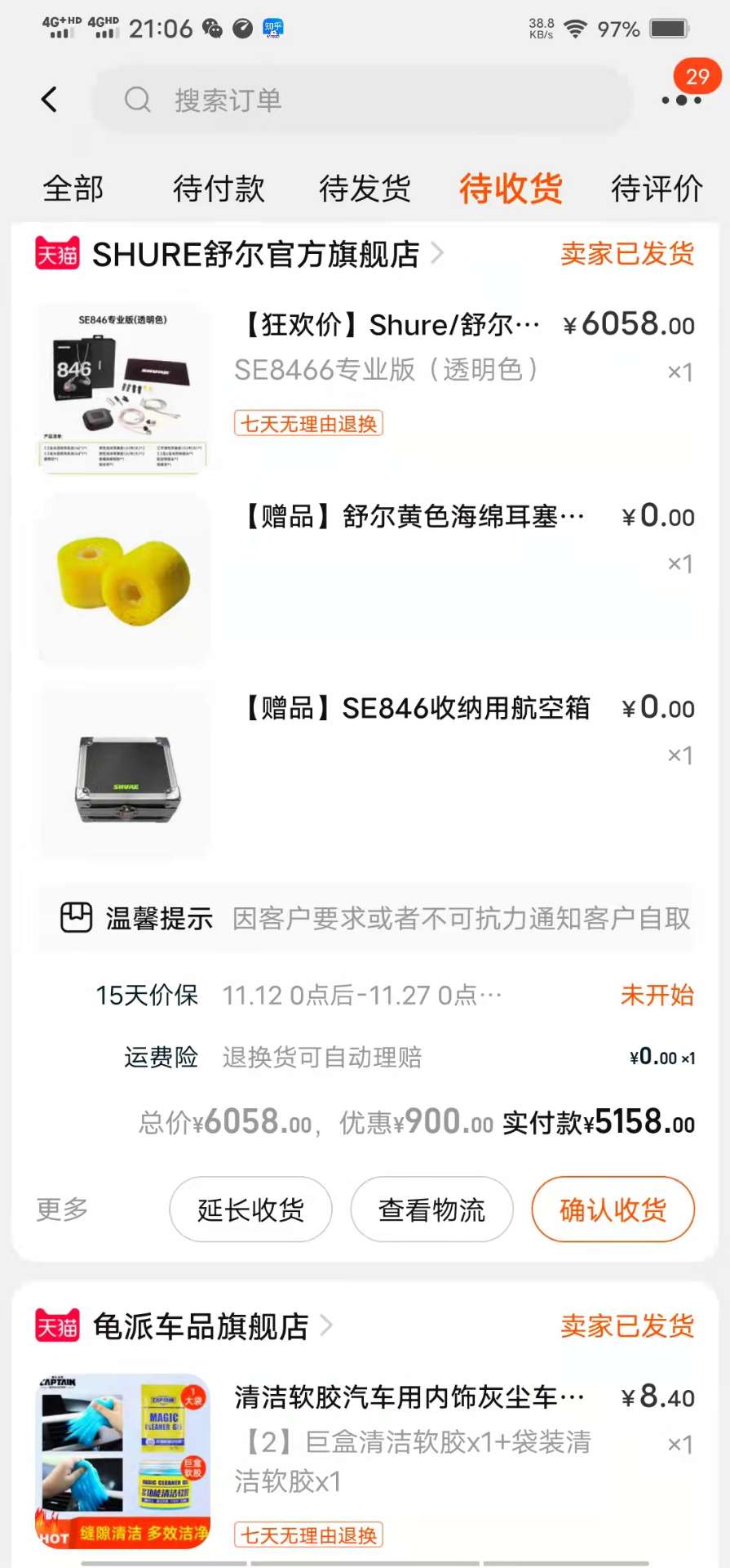 Shure/舒尔 SE846专业版四动铁入耳式HIFI旗舰发烧DIY耳返耳机,天猫旗舰店抢购来的,专业版,不带蓝牙线,有发票和购买记录,正品保证,便宜卖了,咸鱼几百好评,芝麻773,赠品价值300元一起送了