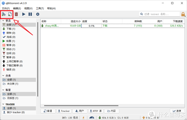🔺可以看出,qBittorrent 比较简单清爽。下载的时候,点击左上角两个图标,分别添加磁力链接或种子就可以下载了。
