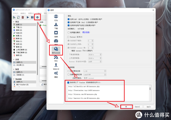 🔺打开 qBittorrent,按照上图的方法将 trackers 粘贴进输入框,并勾选 “自动添加以下 trackers 到新的 torrents”即可。