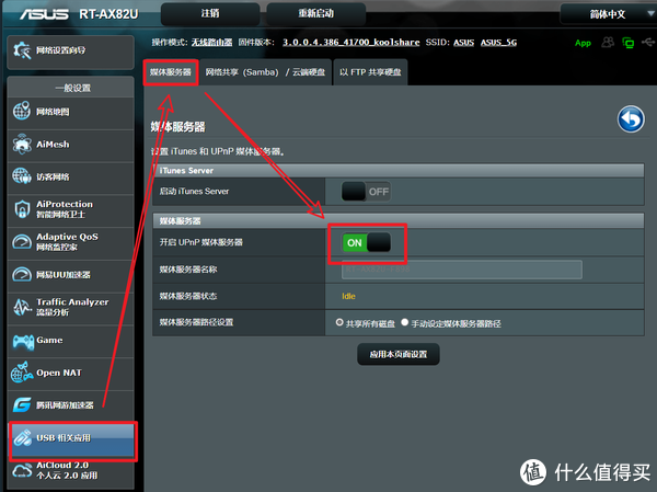 🔺这个不同的路由器开启的路径也不是一样的,具体的请对照自己的路由器咨询客服或者百度都可以。比如说上图就是我的华硕路由器的开启方式:[一般设置] > [USB相关应用] > [ 媒体服务器] 标签页,然后选择ON / OFF来开启或关闭UPnP媒体服务器。