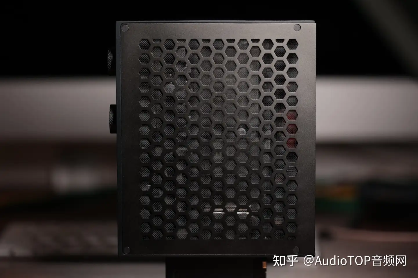 在外形上R7是一个规整的六面体。正面是屏幕和旋钮,除了UI交互之外,还有耳机输出。背面是各种数字和模拟的I/O、LAN口、SD卡槽和电源接口等。机身两边是蜂巢网孔侧板,工业风十足,在散热的同时也提供了视觉辨识度。