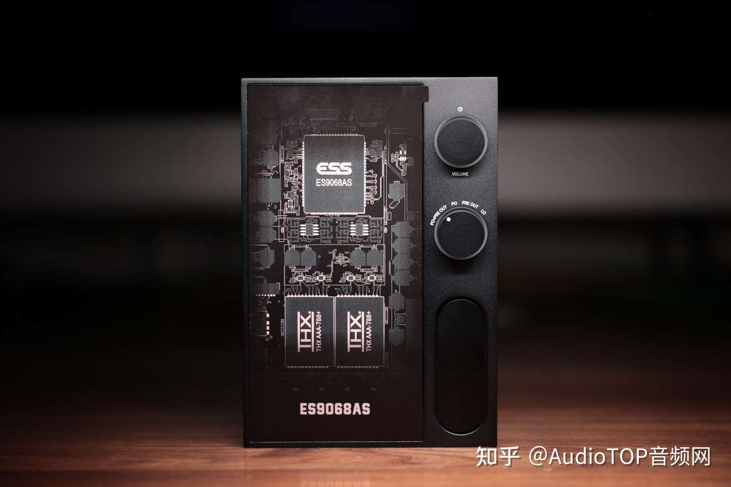因为R7是竖立放置的,所以内部的PCB板也是竖向的姿势,于是可以充分利用空气对流来散热。电源板、数字板、解码耳放板彼此独立,各司其能,最大限度地隔离机械振动和电气干扰。音频主架构由ES9068AS解码和两个THX AAA 788+耳放构成。ES9068AS是ESS公司的桌面级DAC次旗舰,性能位于第一梯队。THX AAA 788+是低失真、低噪声、高输出功率的耳放模块,综合性能强悍。