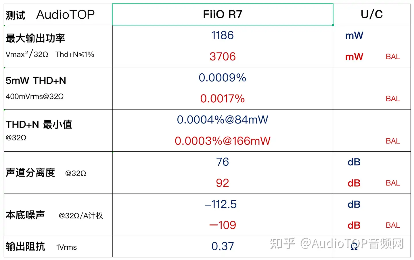 R7的平衡口标称最大功率输出是3200mW。不过AudioTOP发现这竟然是反向虚标,因为实测值高达3706mW。配合低输出阻抗,驯服低灵敏度的平板类耳机不在话下。此外,THD+N在宽广的功率输出区域内保持了良好的抑制,平衡口最低下探到了0.0003%。测试表明ES9068AS和THX AAA 788+的组合表现很稳健。