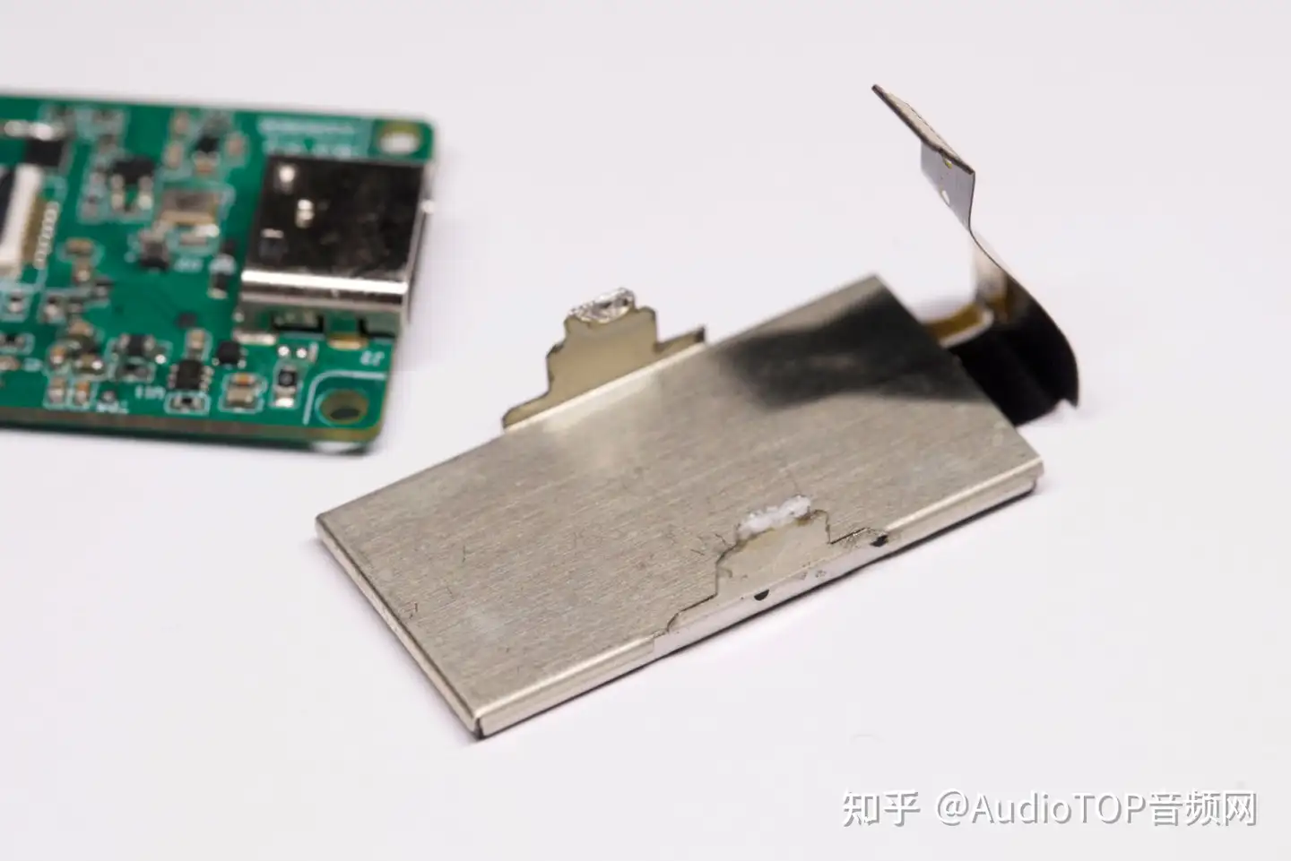 屏幕用一个金属片支架贴附,这样既能稳固支撑屏幕,也屏蔽掉屏幕工作时向外发射的干扰,在它和DAC芯片之间做一个隔离屏障。