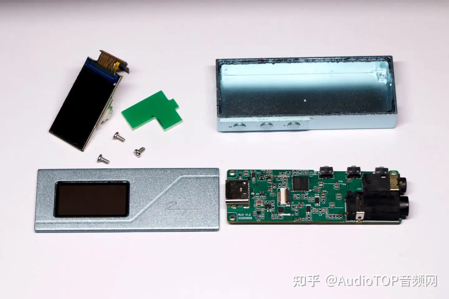 来看一下RU3的电路结构。和其他多数带屏幕的小尾巴一样,RU3采用了CNC成型的金属底壳--通常是铝合金但RU3采用的是航空铝,再加一片带玻璃窗的盖板。RU3的壳体结合相当紧密,摸不出台阶感,以致于一度没找到到接缝在哪。我猜测是它在封装完毕后又对外壳表面做了二次打磨,当然也有可能是加工时误差就很小,一装上就严丝合缝。