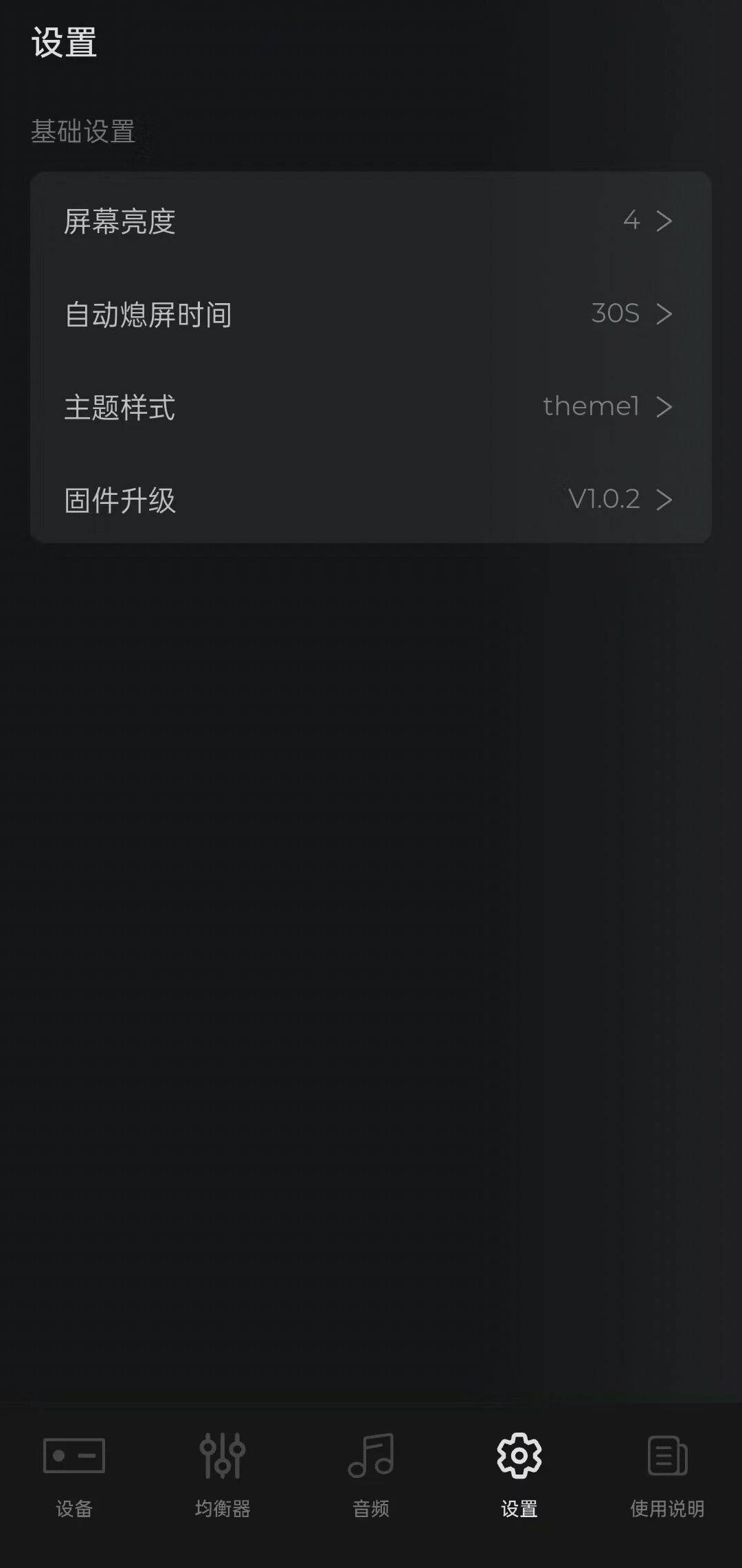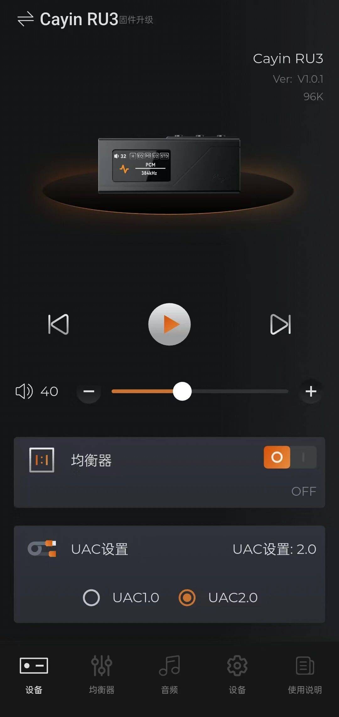 不同设备型号对应的功能及可选操作可能存在差异,实际支持的功能请以设备成功连接后显示的菜单为准。APP 支持 EQ 调节、声道平衡、UAC 模式切换、滤波器、增益、音量调节等功能;网页版目前仅提供固件更新服务。