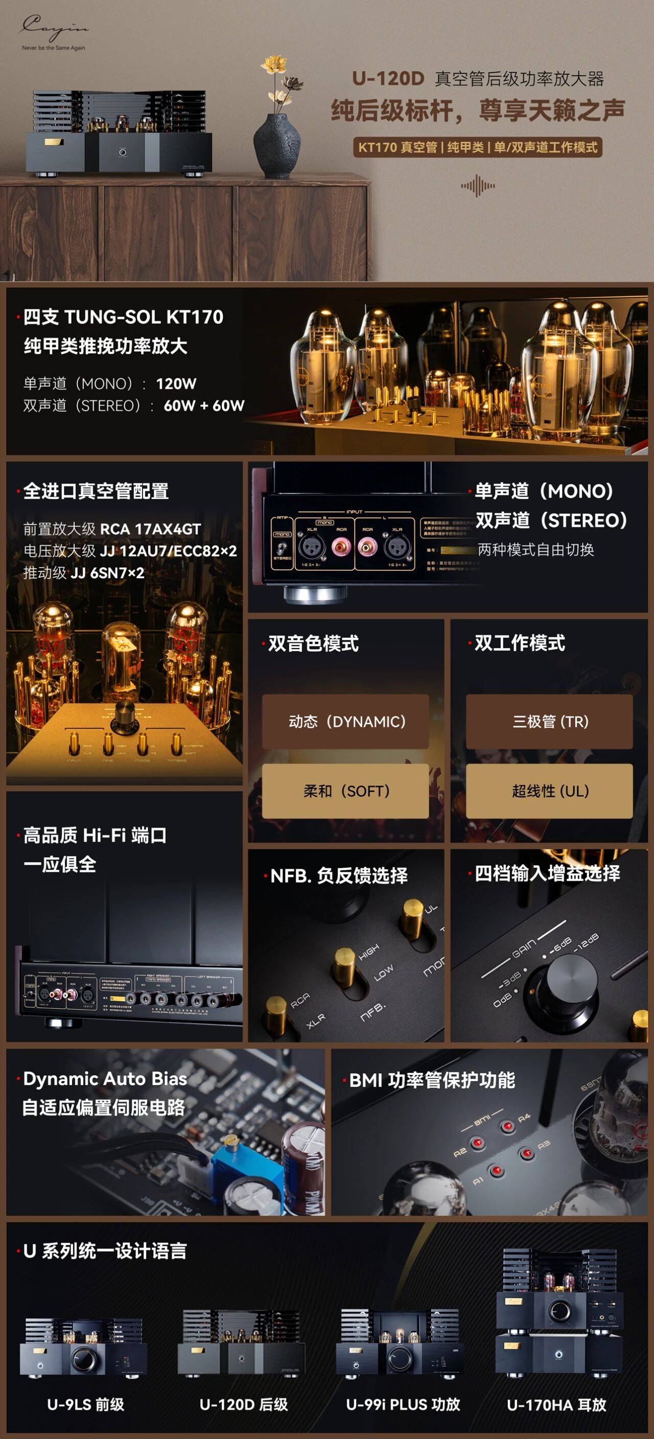 U-120D 纯甲类后级功放,采用四支 TUNG-SOL KT170 做纯甲类推挽功率放大,支持单声道/双声道灵活切换,单声道模式迸发 120W 大功率,双声道模式实现 60W+60W 平衡输出,从容驾驭市面主流高端音箱系统。提供双模式丨双音色丨负反馈选择,用户可根据音乐类型或音箱特性调整声音风格,实现个性化的音效体验。