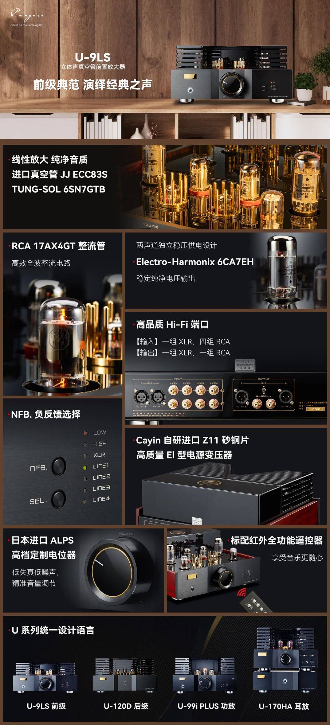 立体声真空管前置放大器 U-9LS,采用全进口真空管配置,ECC83、TUNG-SOL 6SN7GTB 负责线性放大,并搭载 17AX4GT 整流管做全波整流 ,6CA7EH 稳压管,结合两声道独立供电设计,确保音质纯净且动态表现力强,能细腻还原音乐细节与层次感。