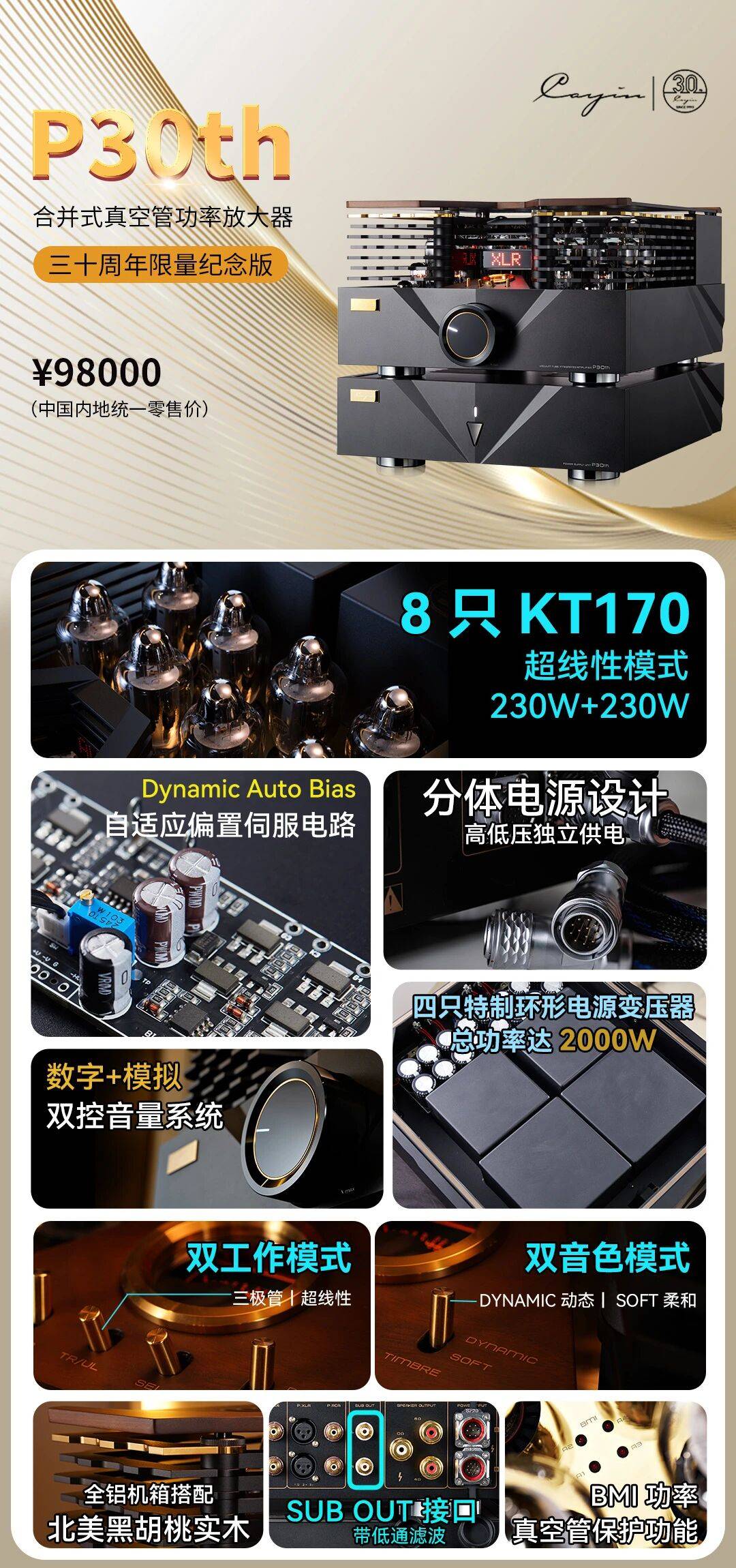 限量版功放 P30th,8 只精选配对的 Tung-Sol KT170 真空管,四管并联推挽式功率放大,配合精心的电路设计,超线性工作模式下输出功率为 230W+230W,强大输出功率足以驱动好市场上大部分主流高端音箱。