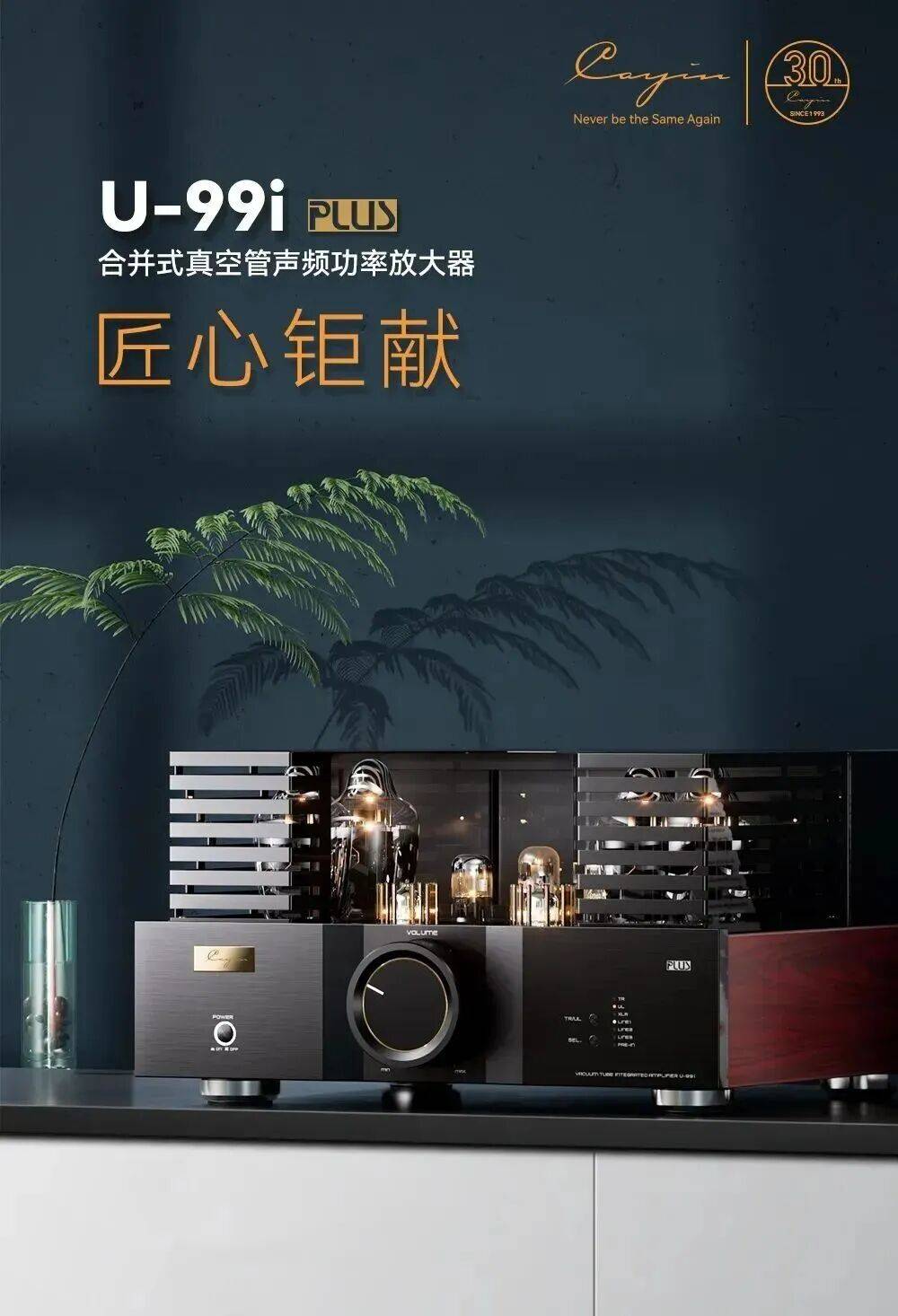 KT170 合并功放 U-99i PLUS,四只 TUNG-SOL KT170 真空管做 AB1 类推挽功率放大,超线性输出功率高达 135W +135W。采用航空铝辅以哑黑氧化着色,北美黑胡桃实木侧板,和音箱搭配也是高级感满满。