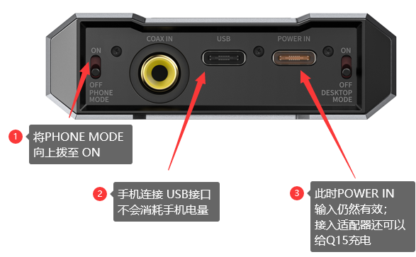 因为电脑使用时,没有续航的烦恼,所以可以将PHONE模式打至“ON”,同时建议把DESKTOP模式也开到“ON ”,这样可以让Q15发挥出更多的性能即,PHONE MODE开关拨至OFF,即表示从USB口取电流,这时适合接电脑做USB解码使用,Q15也是默认打开充电的。
